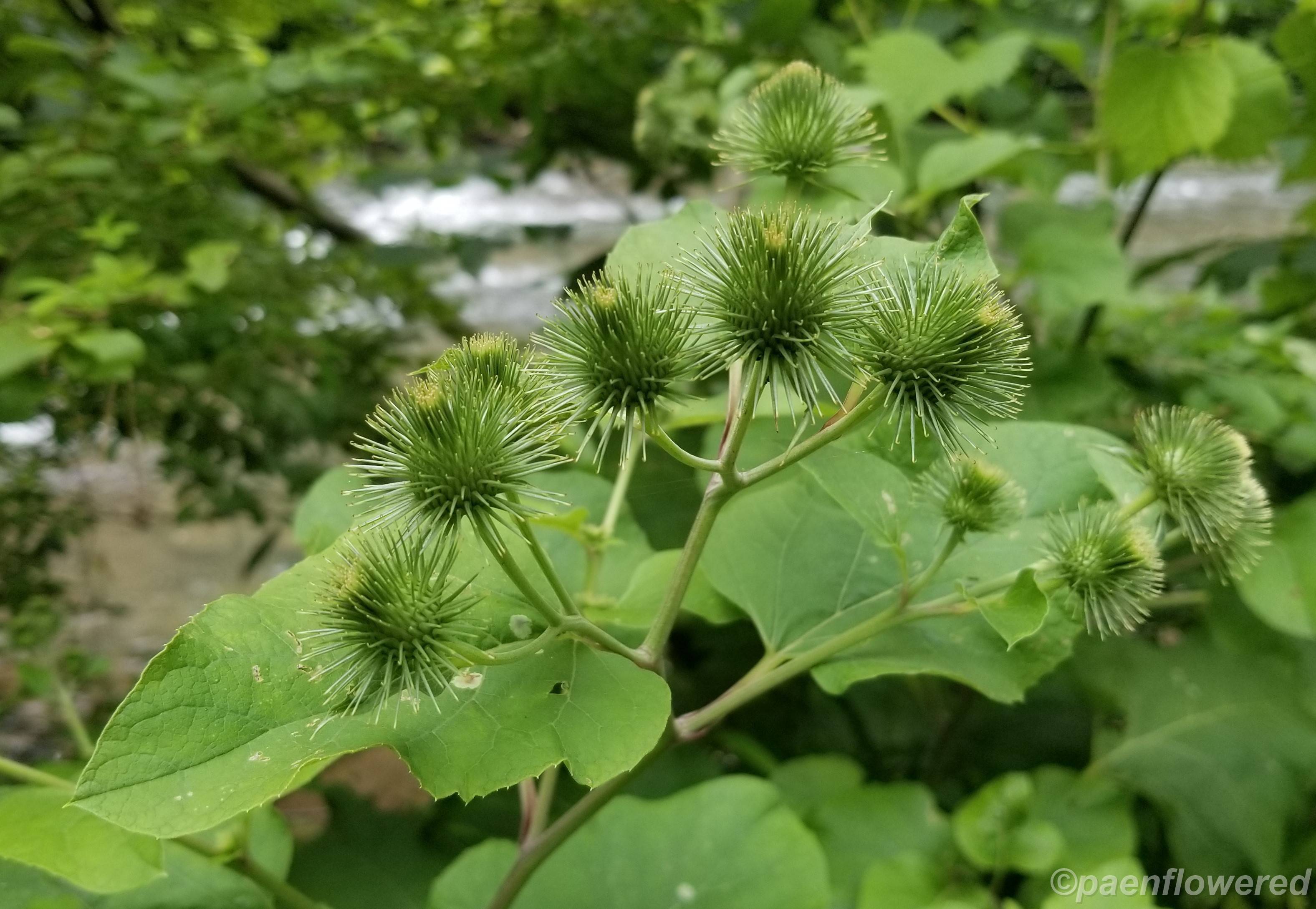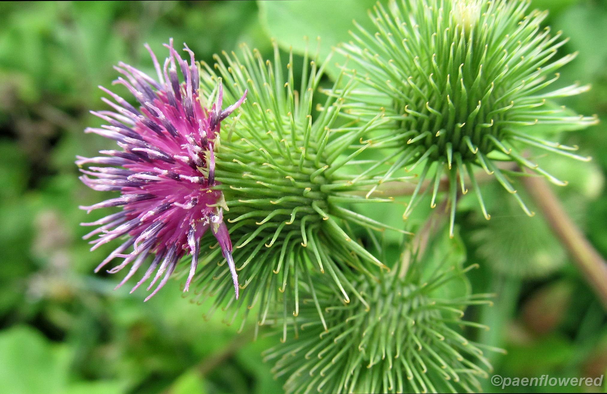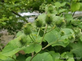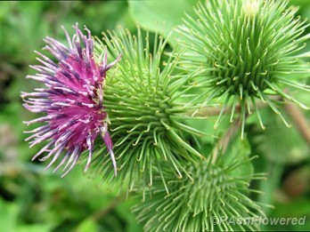 Eurasian burdock with purple flowers & hooked bracts