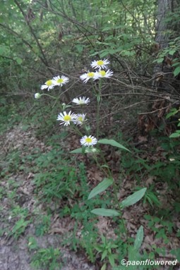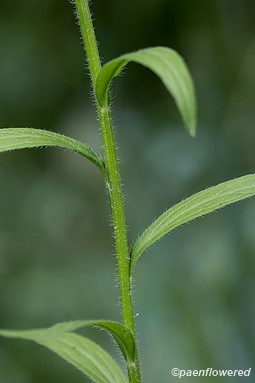 Eastern fleabane tends to have fewer leaves on the stem than the other species and these leaves may only have a few teeth or have no teeth at all. The leaves do not clasp the stem and become sparser towards the top of the stem. On average the leaves are four inches long and about 2/3 inch wide. The slender stem has white hairs, but they lie closer to the stem rather than spreading.