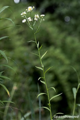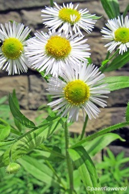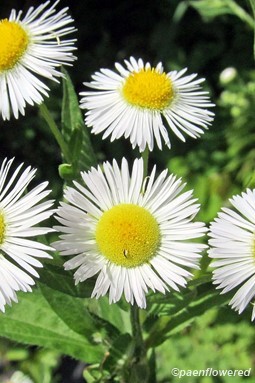 It is a native annual or biennial or perennial plant and can grow up to three feet tall. Like the other fleabanes it is a member of the aster family and has numerous yellow disk flowers and 40-100 thin petal-like white ray flowers. These ray flowers usually do not have the tendency to turn pink as in Philadelphia fleabane, but this coloration has been seen. Both disk and ray flowers are fertile and can self-fertilize if not pollinated. Each composite flower is about ½ inch in diameter. Like the other members of its genus, the seeds form with tufts of hair for wind distribution.