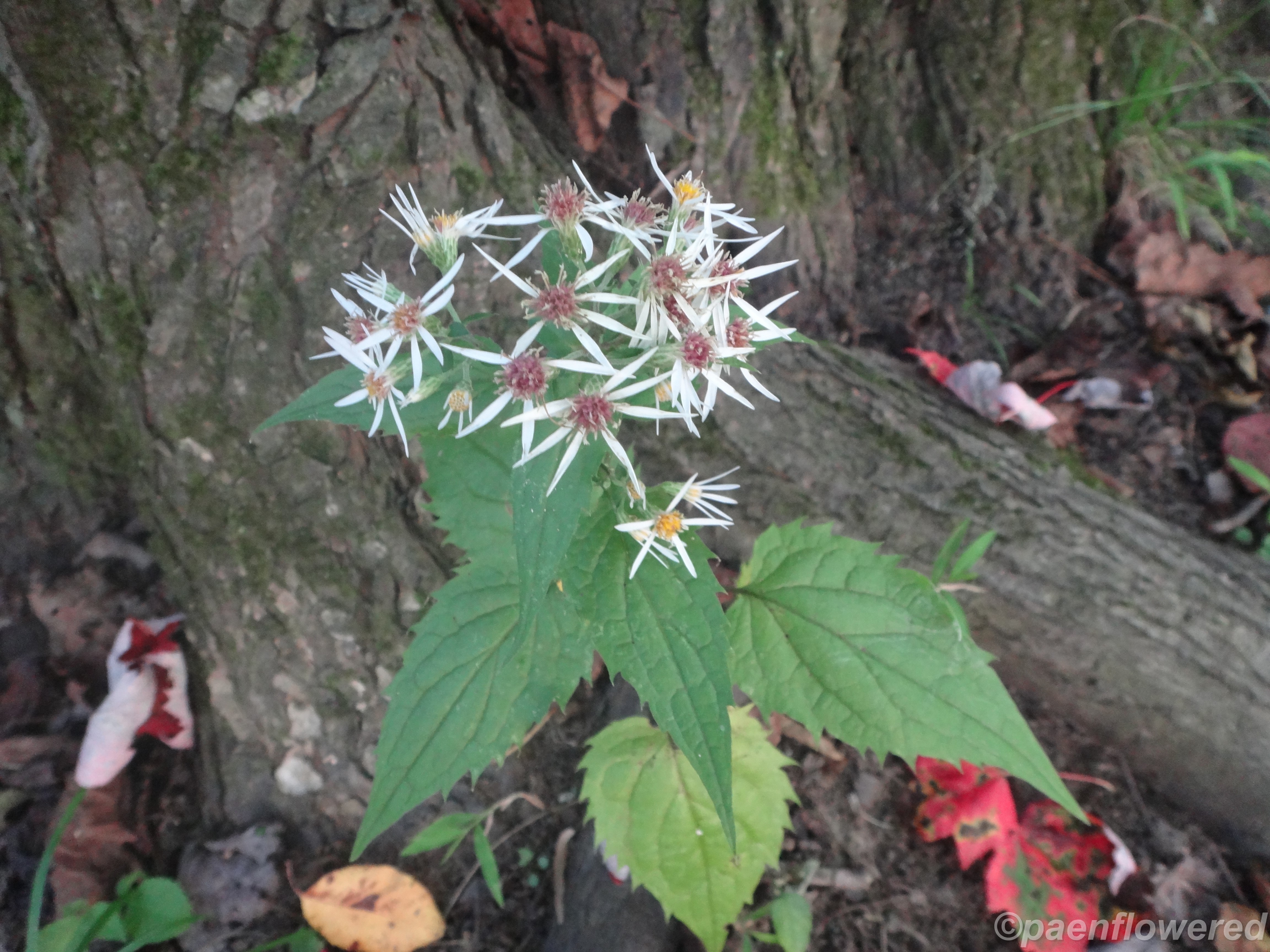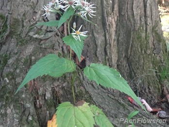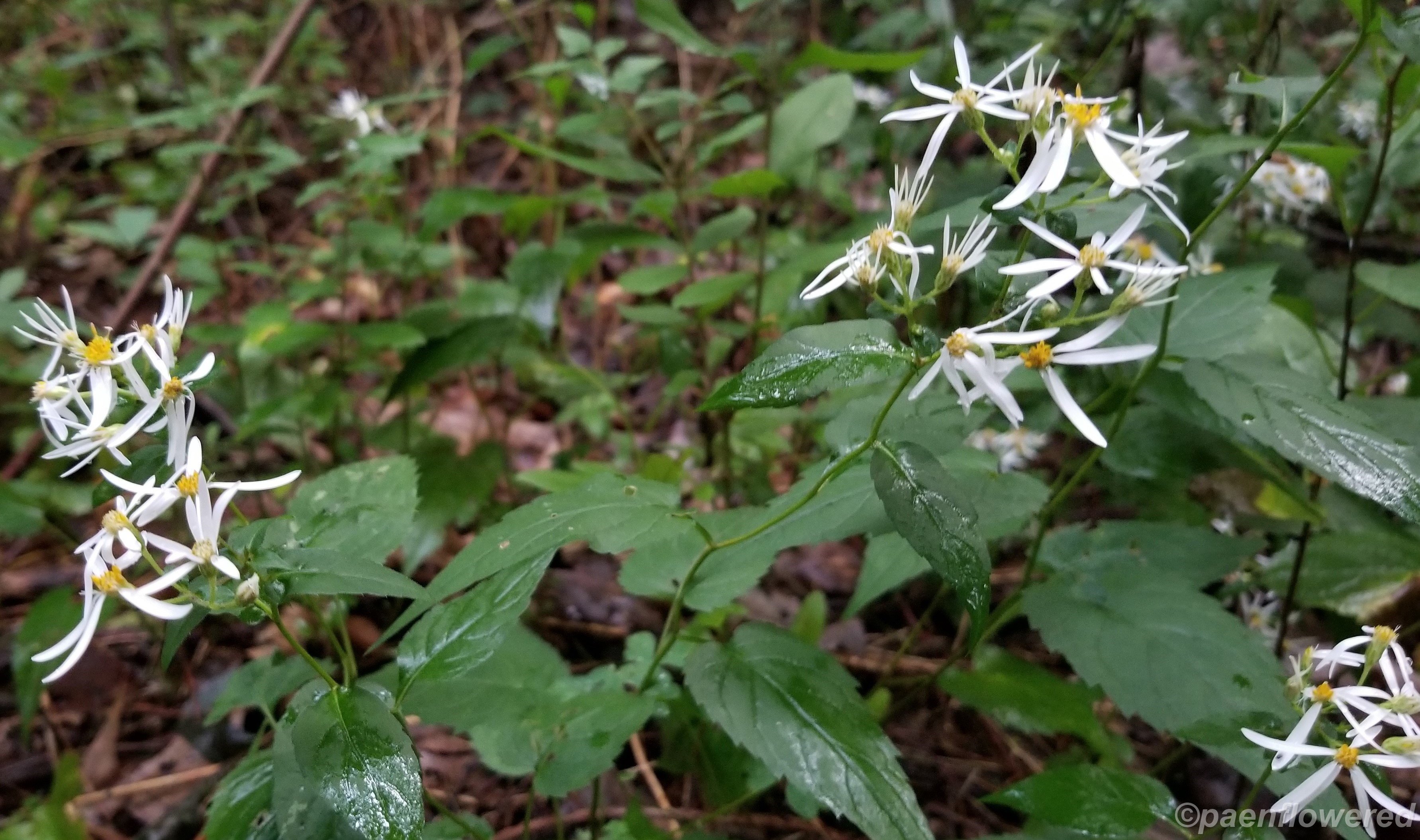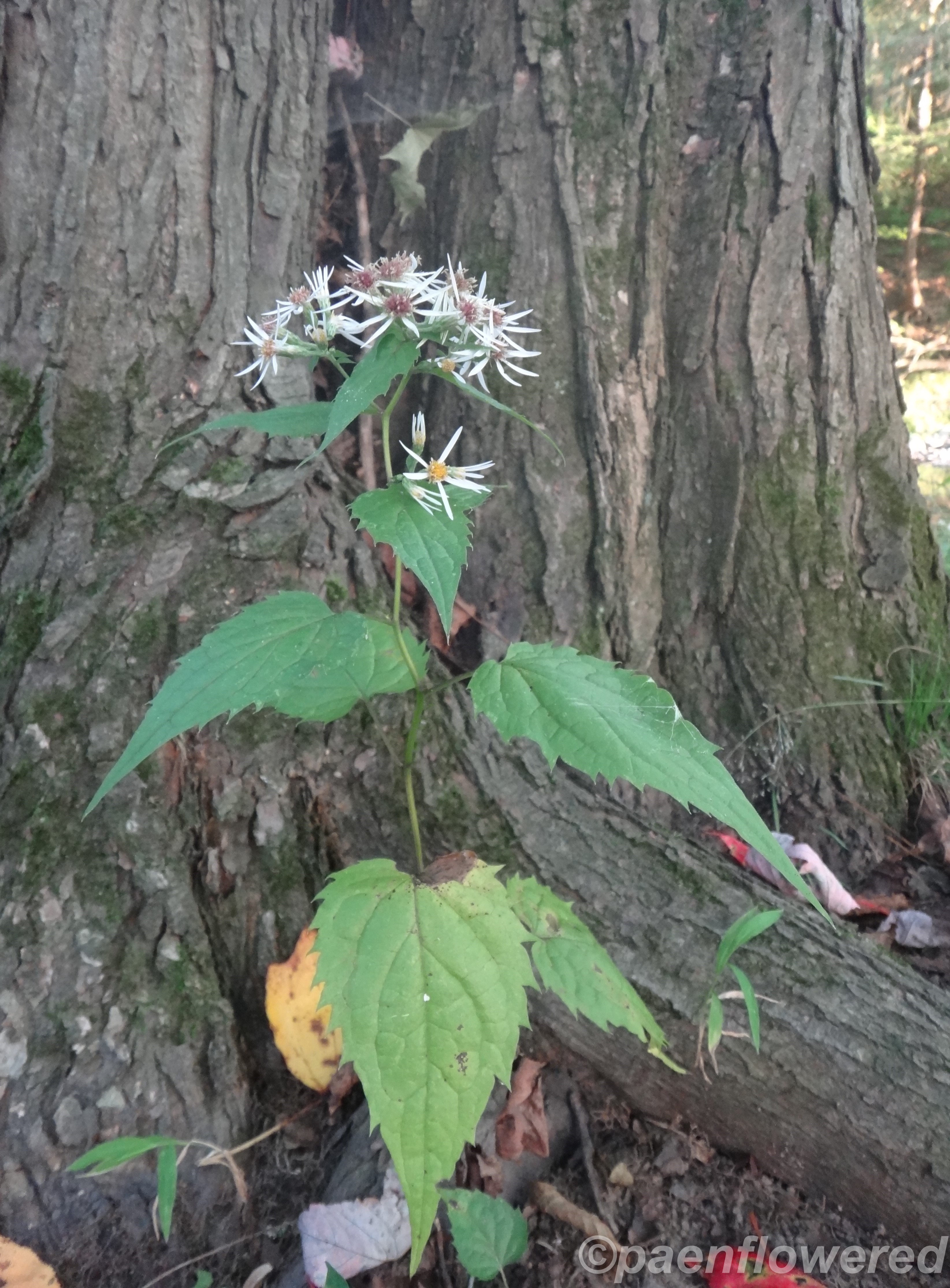 A common aster of the woods, with white petals and heart-shaped, toothed leaves