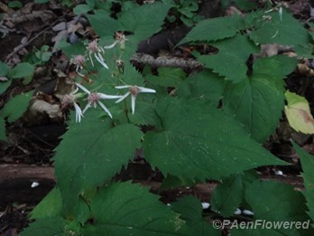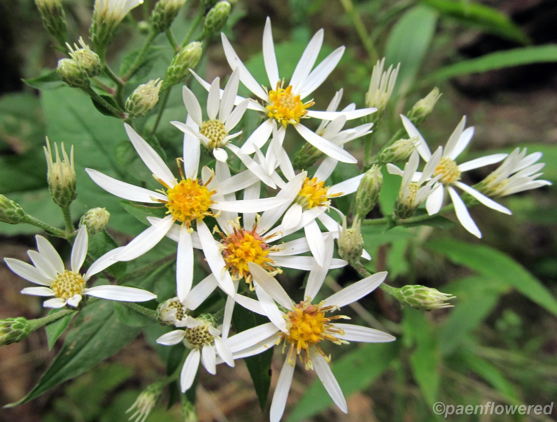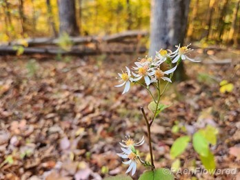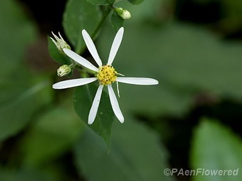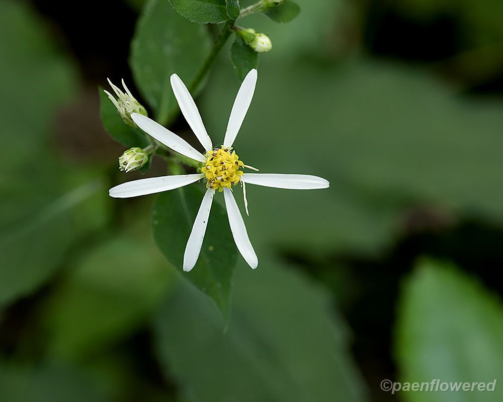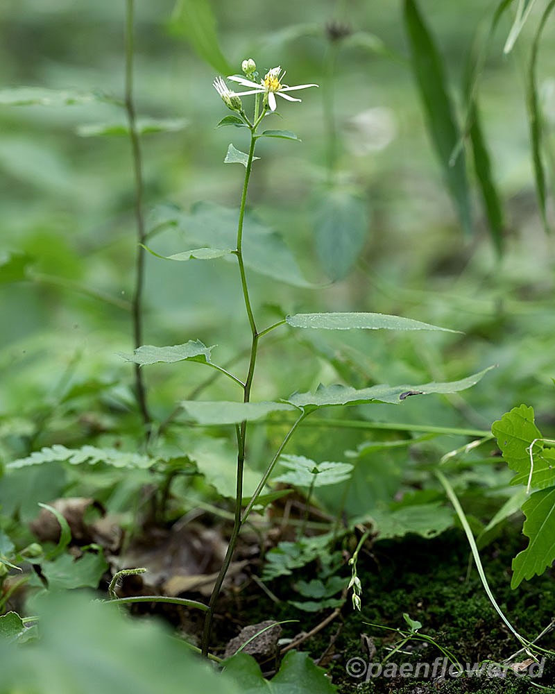 A common aster of the woods, with white petals and heart-shaped, toothed leaves