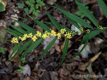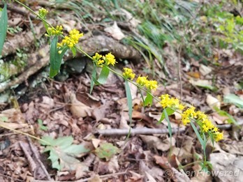 A wand-like goldenrod with tufts of yellow flowerheads spaced along the stem