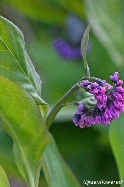 The foliage is initially purple and turns green very quickly. The leaves are oval, smooth, bluish-green to grayish-green, strongly veined and 2 to 8 inches long. The stems are succulent and smooth, supporting elegant, nodding flowers that begin as soft pink buds before maturing into delicate, pendulous blue bells with a light fragrance.