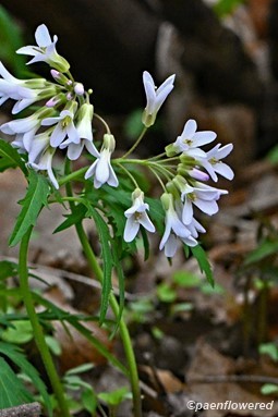 In various localities, this species is also called: lady's smock, crow’s toes, crinkleroot, milkmaids, pepperroot, pepperwort, and toothache root. It was a common belief that the shape of a plant was a sign of what human ailment that plant could cure. Native Americans did use mashed roots of this plant to treat toothaches. The leaves of the toothwort are edible and said to be tasty if boiled with a little salt. The medical treatments are unlikely and there are better sources of wild food than these leaves.