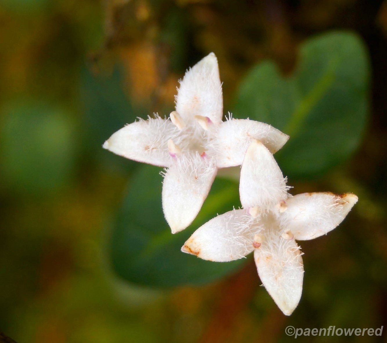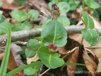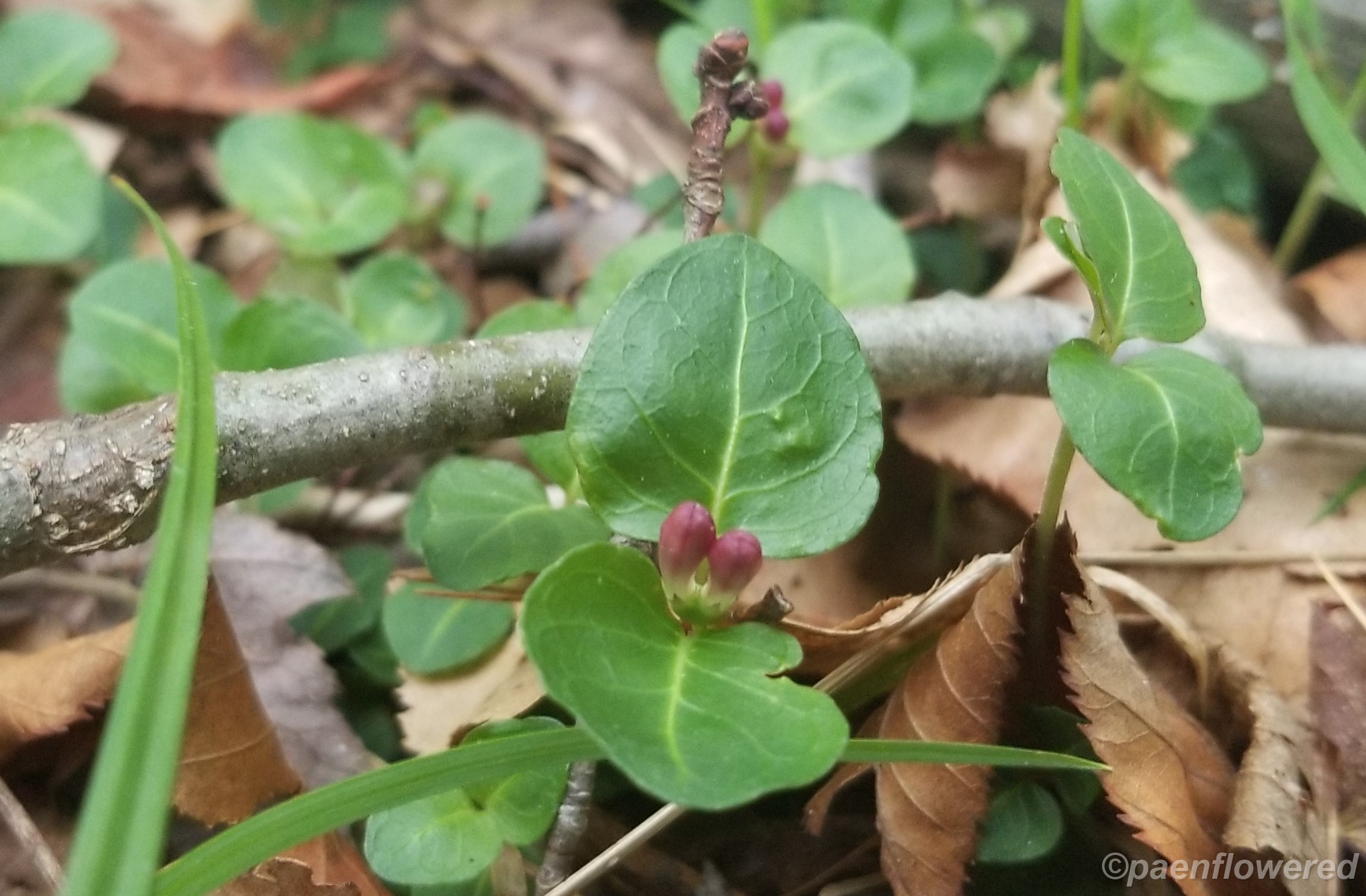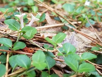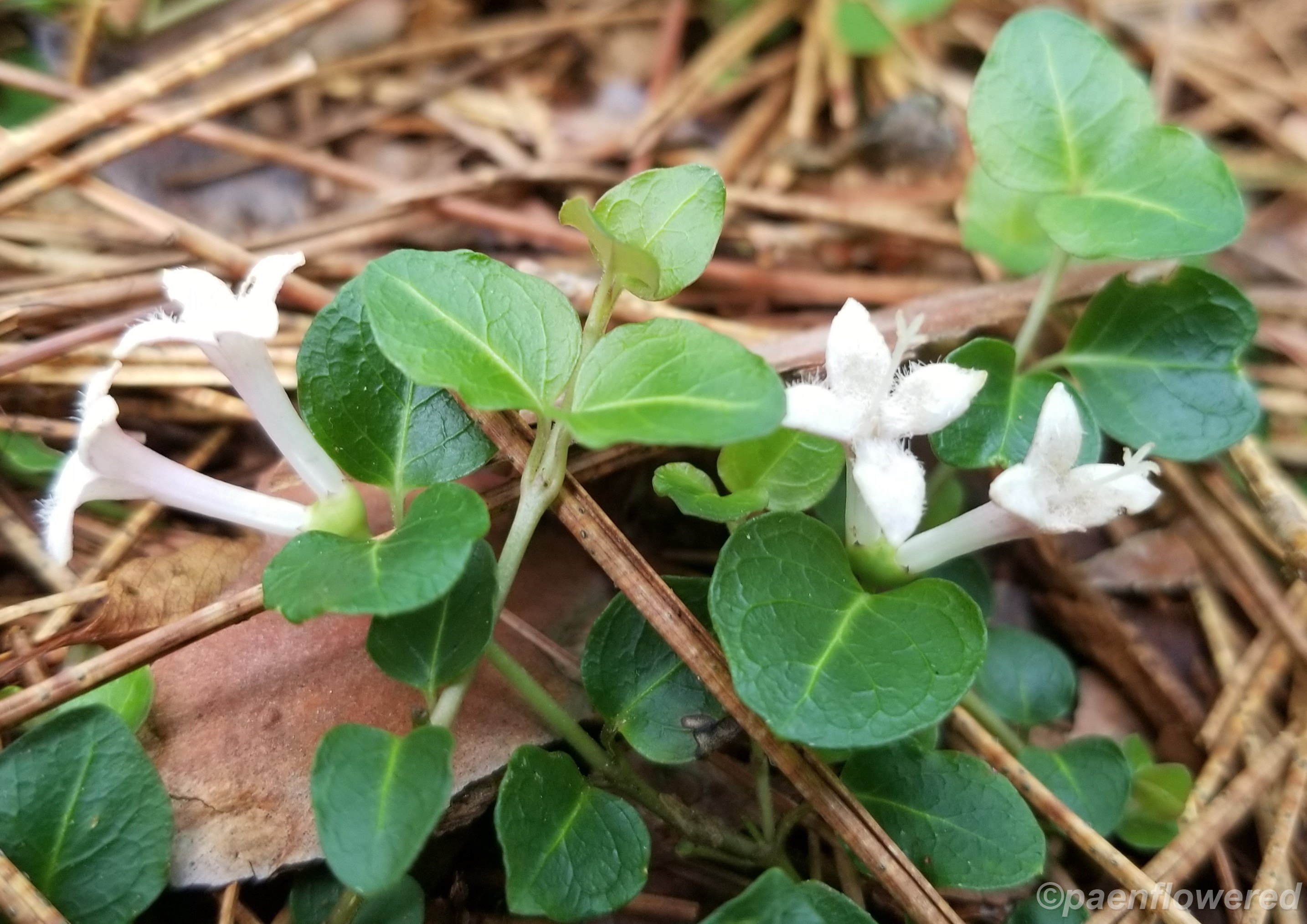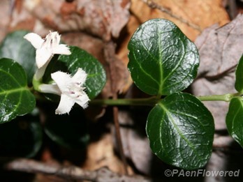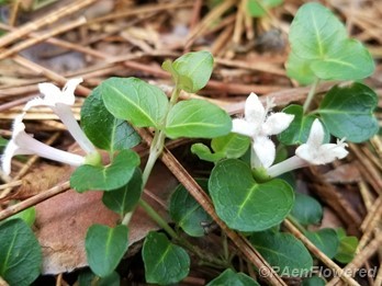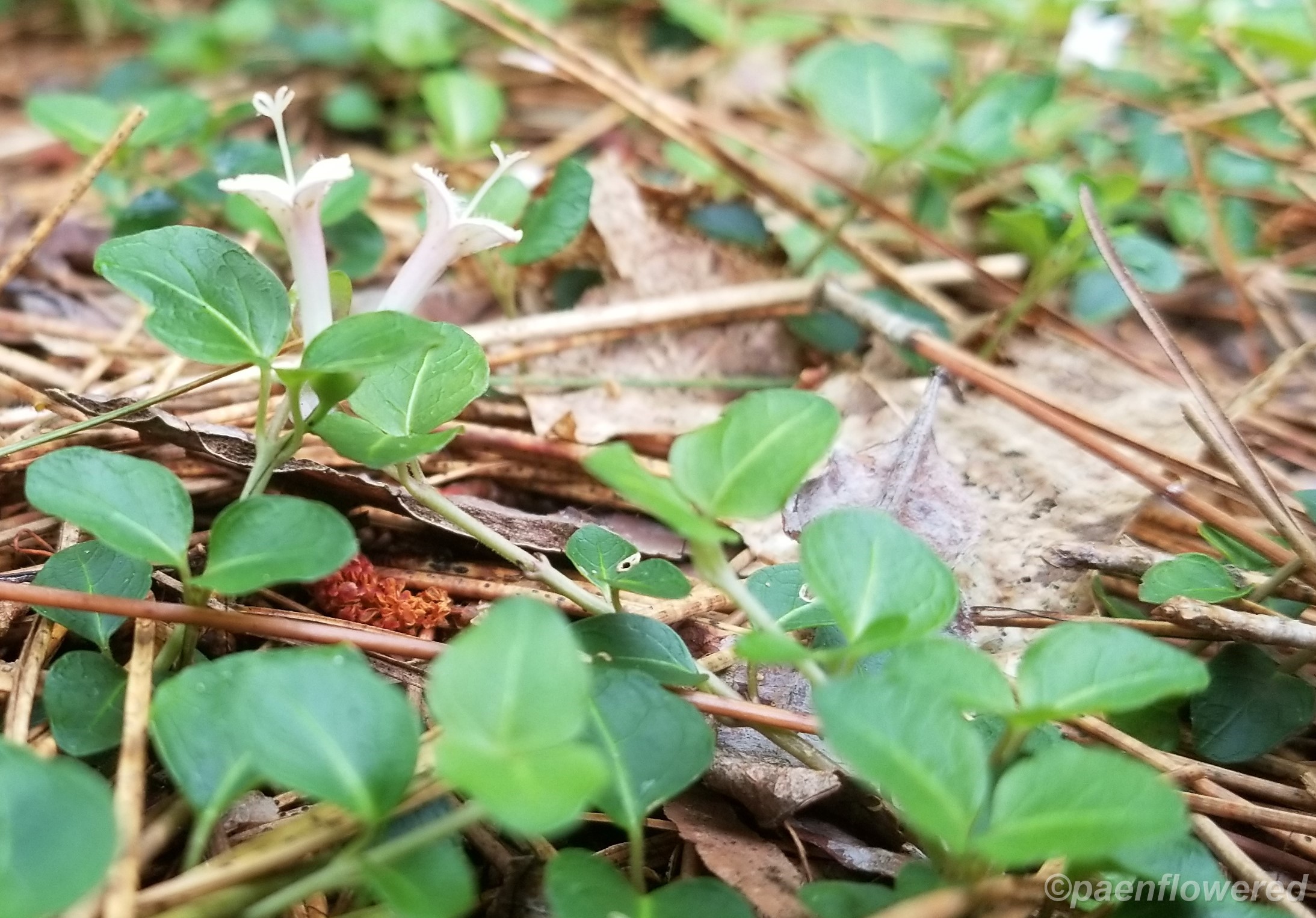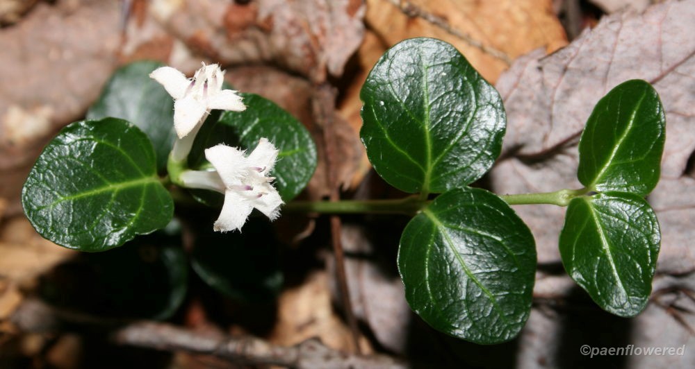 Dainty, white flowers appear in pairs as do evergreen, roundish leaves.