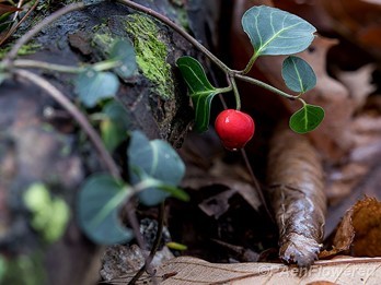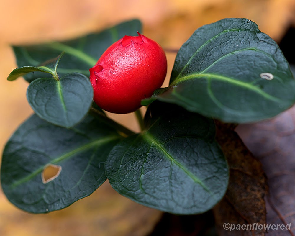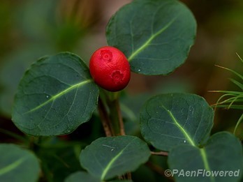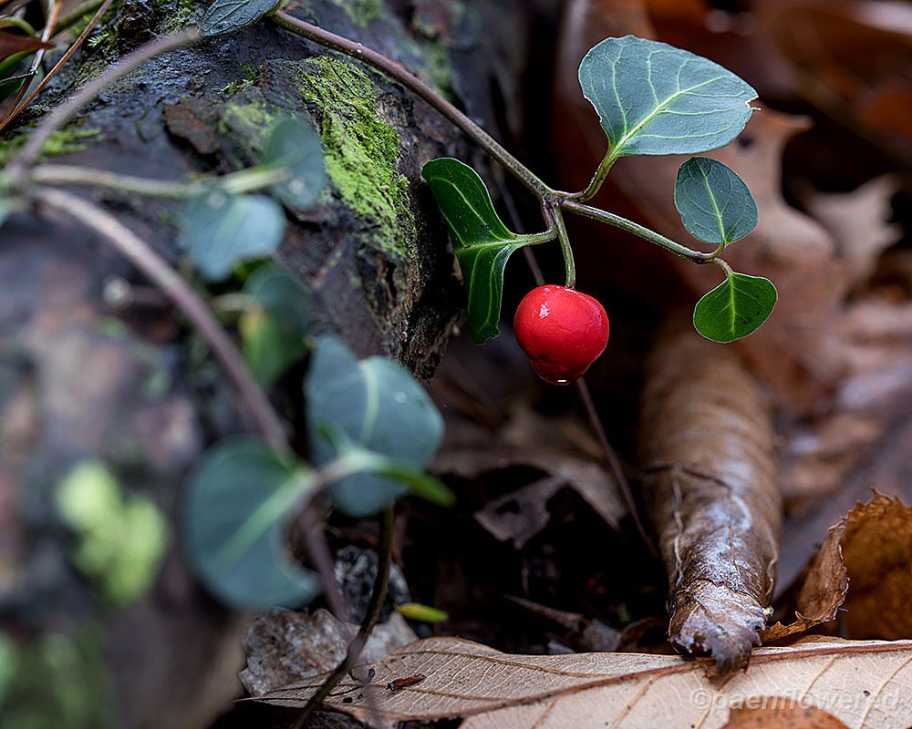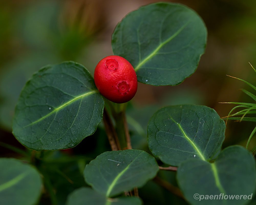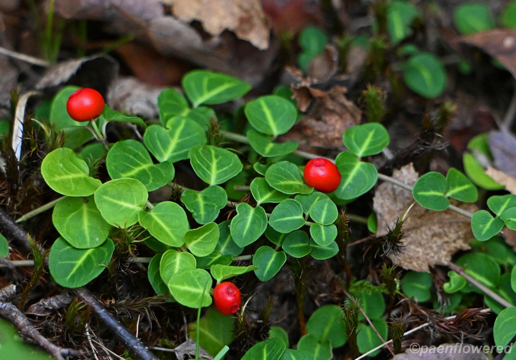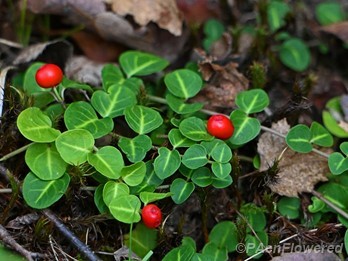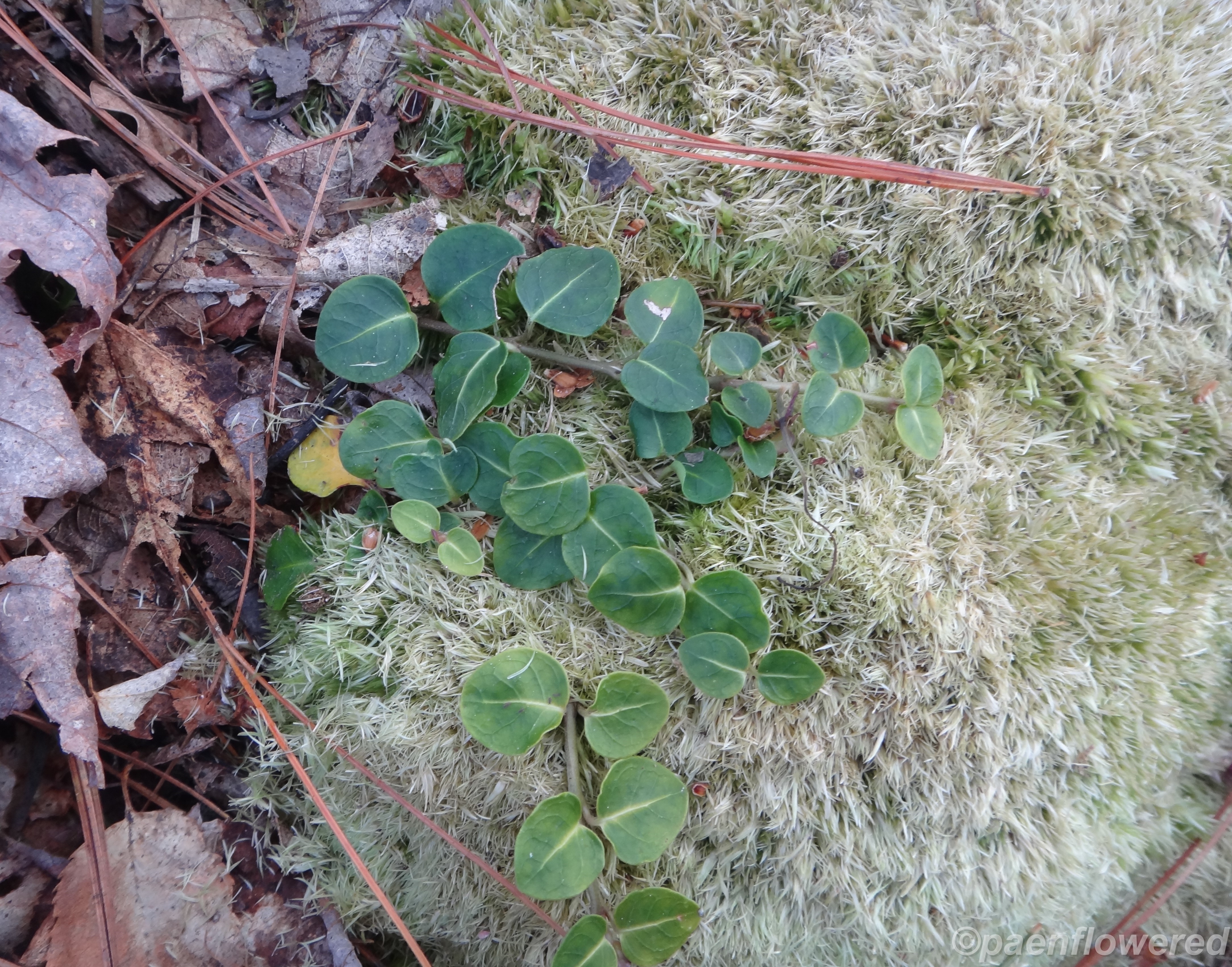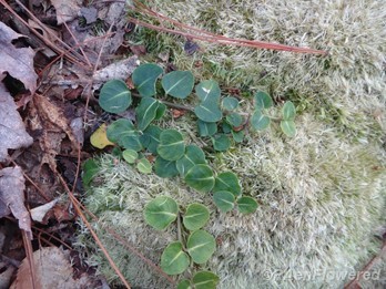 Partridge-berry likes to grow with Canadian mayflower, covering the ground of the woods.
