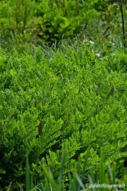 This stately fern may look like a small shrub growing in clusters, thus its common name royal fern. It is found in wetland places, such as bogs, marshes, and swamps. Because the fertile pinnae are clustered at the top of each frond, this fern looks like it is flowering and so is called the flowering fern. These 'flowers' bear many thousands of tiny spores. The foliage is pale green in sunlight and bright green in less intense light. The leaves are reminiscent of those of a locust tree or other species from the legume family.
