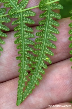 Sori small, round, distinct. Indusium pale tan, with minute orange glands, narrowly kidney-shaped.
