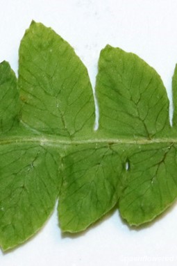 Pinnae lance-shaped, cut nearly to midvein into 12 or so rounded or blunt-tipped lobes; margins not toothed. Widest at the rachis. Fertile pinnae appear narrow and constricted because the margins curve over the sori. Veins of sterile pinnae mostly forked.